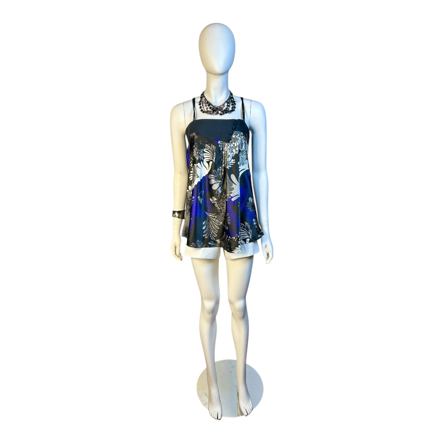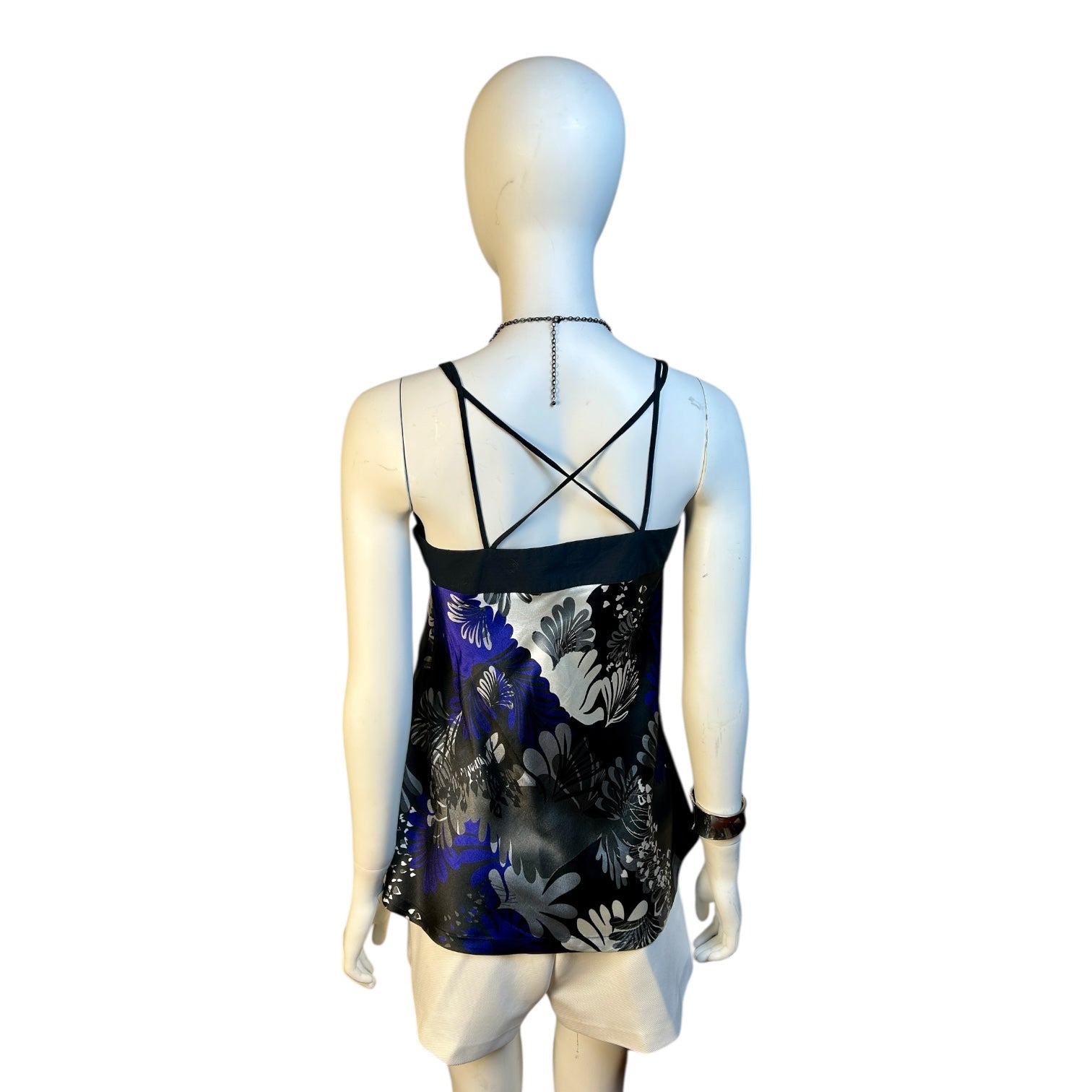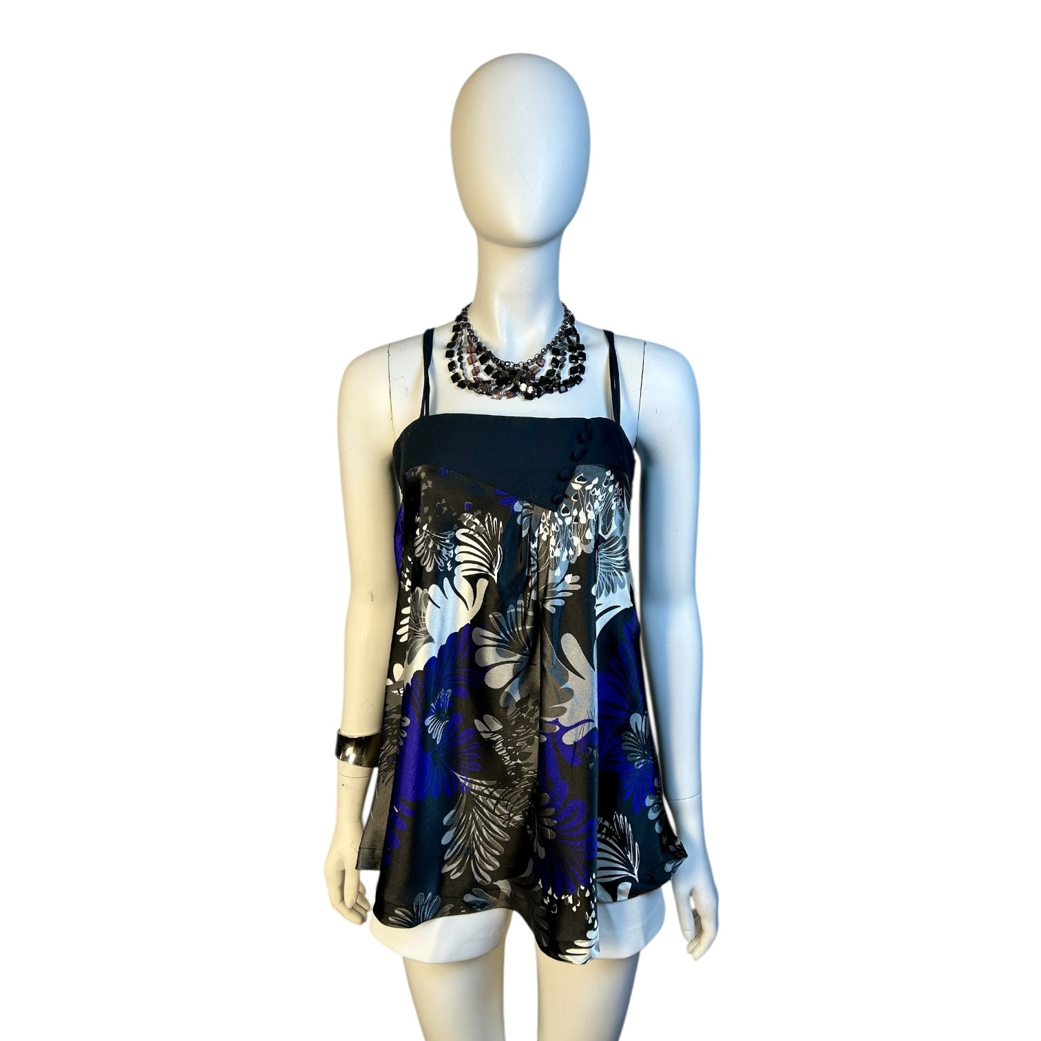 Color: Negro con estampado floral en tonos blanco, gris y azul eléctrico