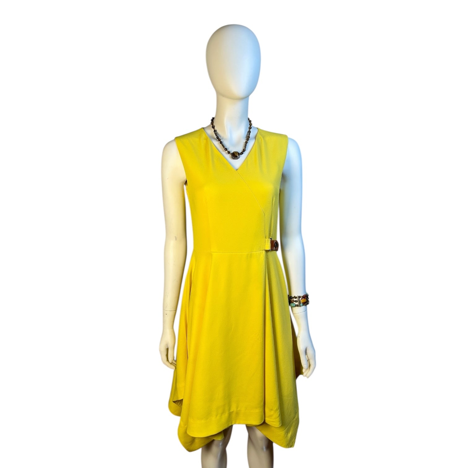Este alegre vestido amarillo aporta frescura y movimiento a tu outfit. Su corte cruzado y entallado realza la figura, mientras que la falda con caída asimétrica añade un toque dinámico y moderno. Ideal para usar en eventos de día, brunches o reuniones informales donde quieras destacar con estilo.