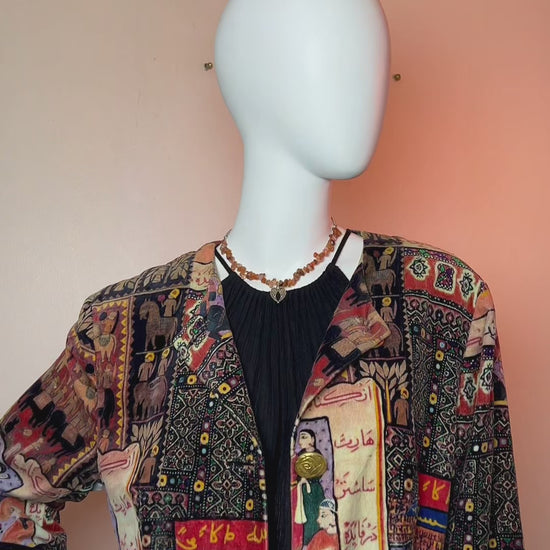 Este blazer destaca por su estampado artesanal inspirado en los tejidos y motivos tradicionales de la India, con una mezcla de figuras, flores y patrones geométricos llenos de color y simbolismo. Su textura firme y diseño estructurado aportan elegancia, mientras que su estilo bohemio lo convierte en una pieza ideal para realzar cualquier look. Combínalo con jeans, faldas o vestidos para un toque artístico y exótico.