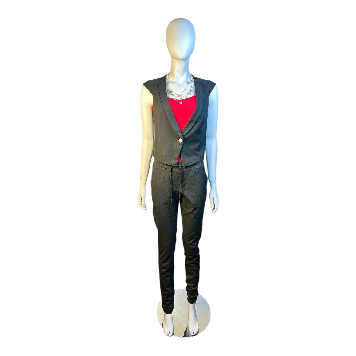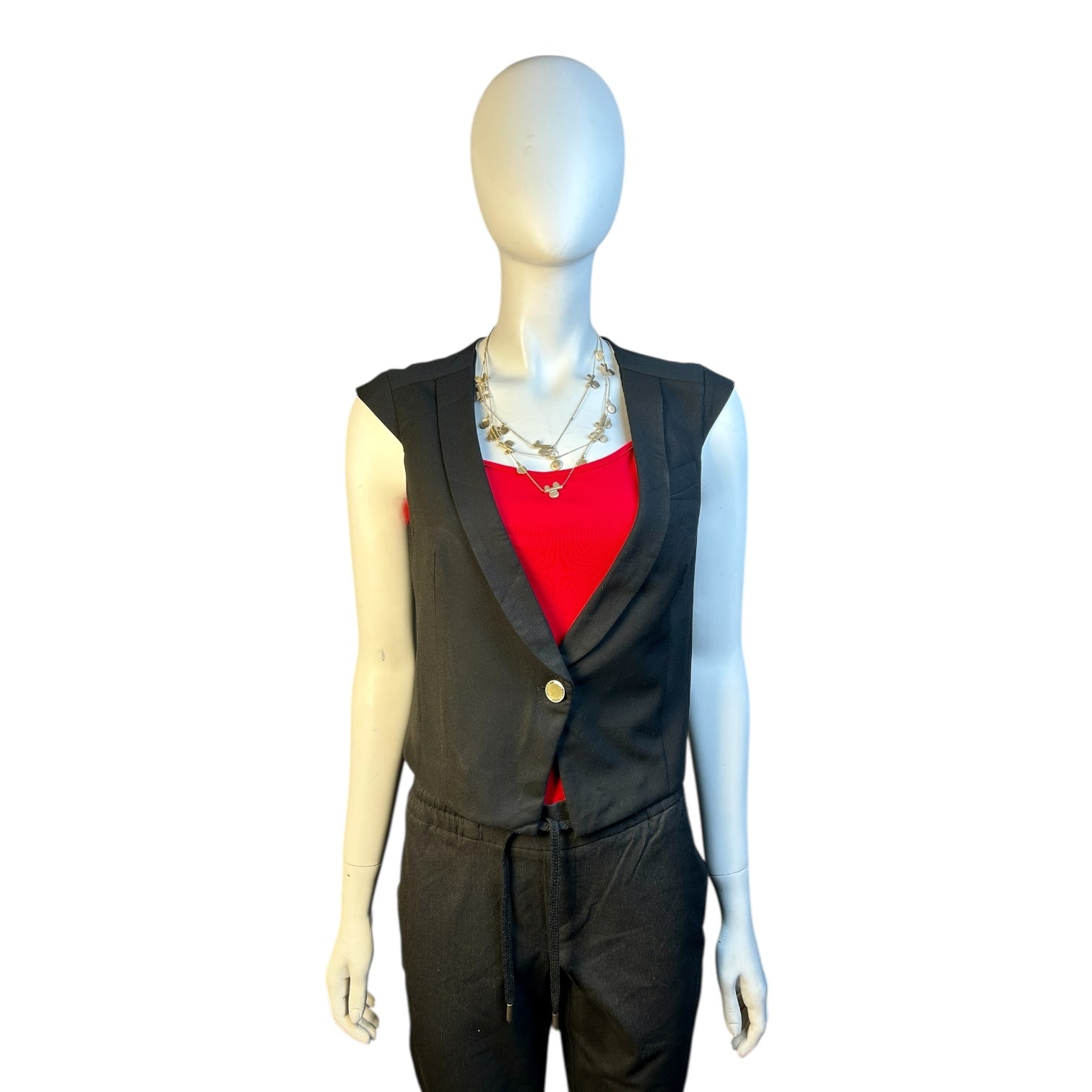 Detalle: Botón dorado al frente; sin mangas; espalda lisa y sin brillos