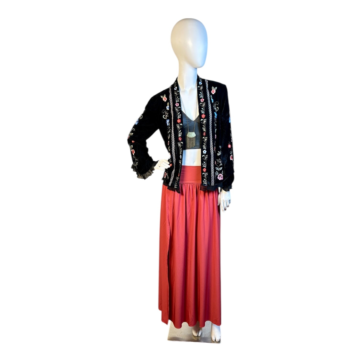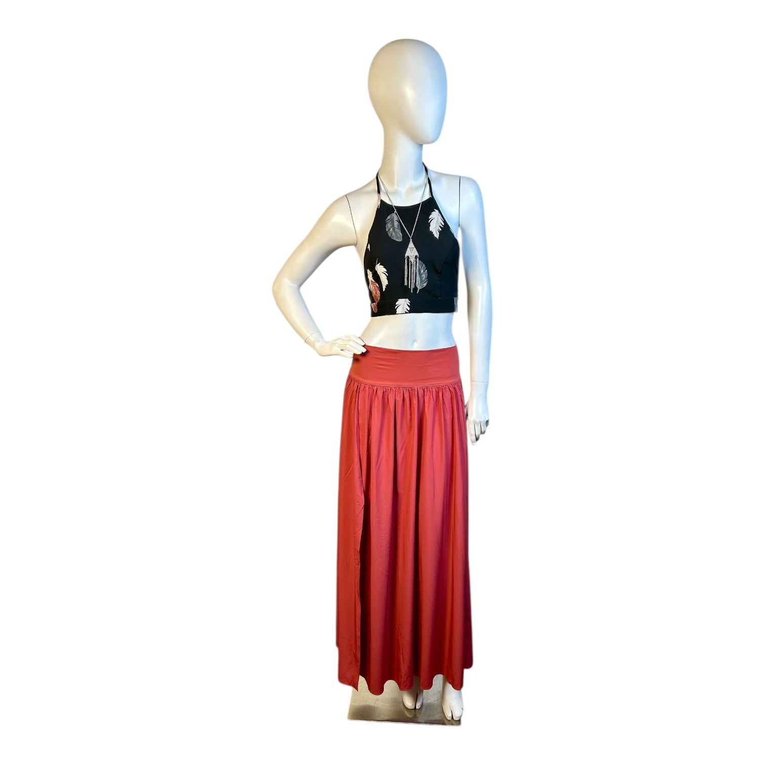 Corte: Falda larga de tiro alto, con caída fluida y abertura profunda en un costado