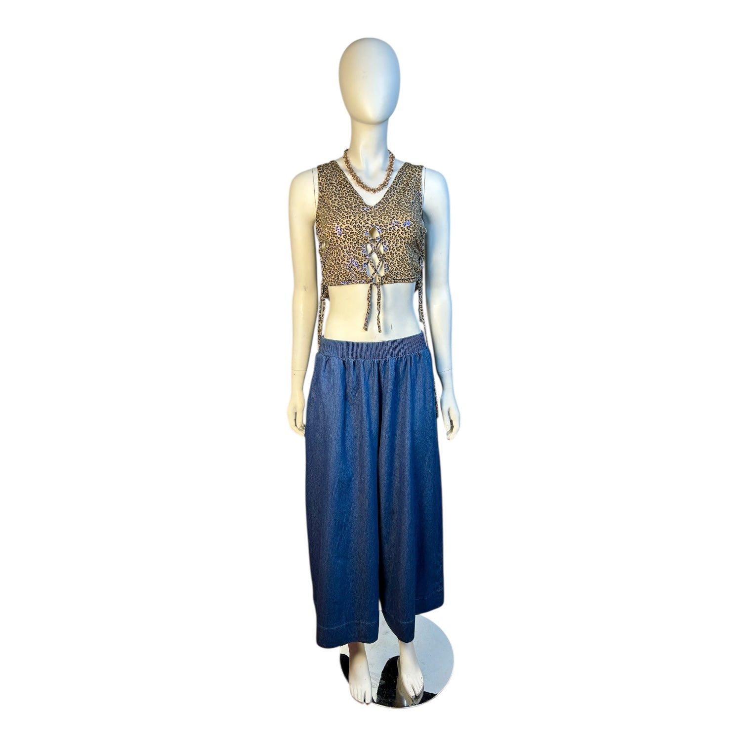 Este pantalón palazzo de mezclilla ligera es la mezcla ideal entre comodidad y estilo contemporáneo. Su corte amplio brinda libertad de movimiento y un look relajado, mientras que la pretina elástica asegura un ajuste cómodo para cualquier tipo de cuerpo. Es perfecto para climas cálidos, días de paseo o para armar un outfit boho-chic sin esfuerzo.