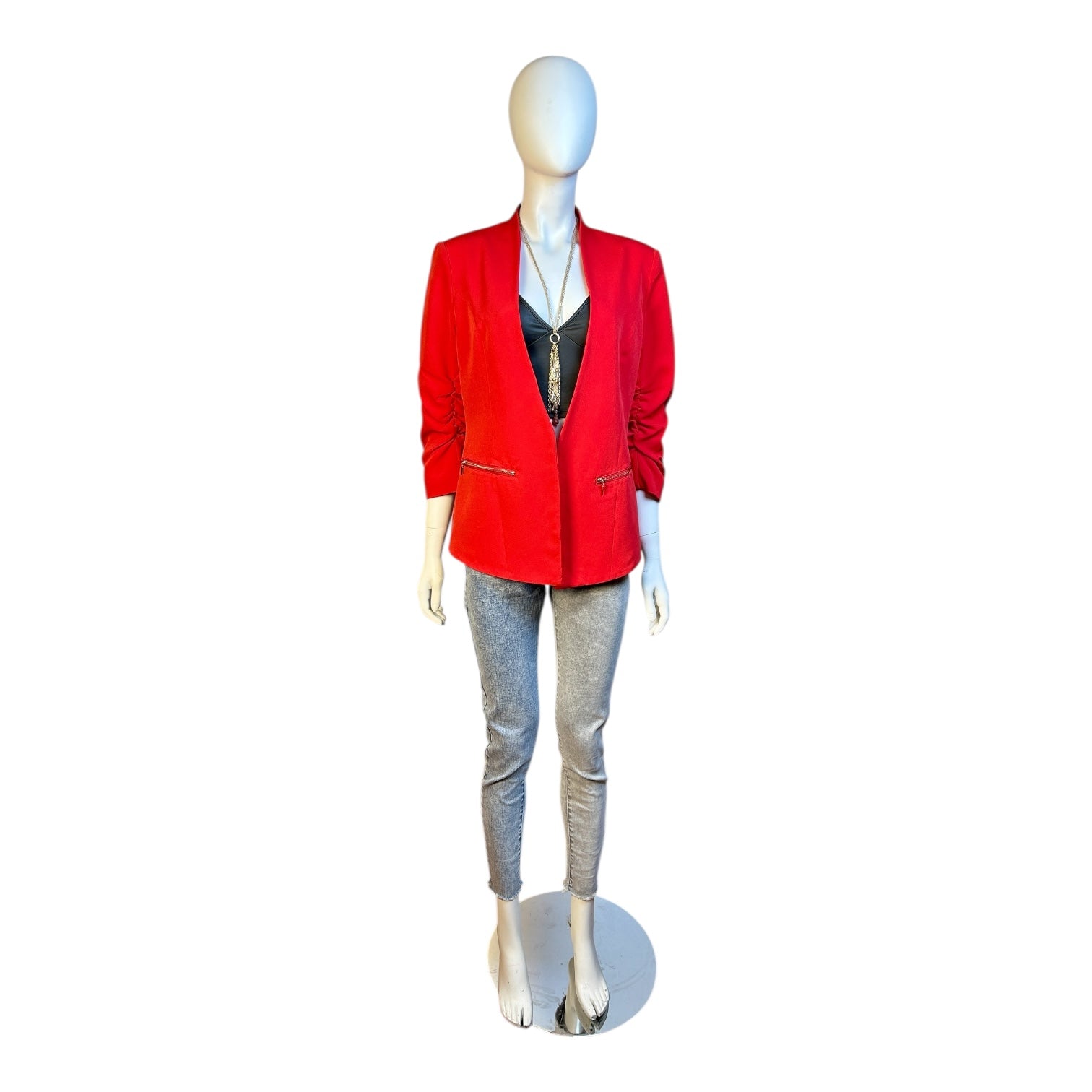 Este blazer rojo fuego es la definición de poder y estilo. Su diseño limpio sin botones le da una silueta moderna y minimalista, mientras que los cierres metálicos le añaden un toque edgy. Las mangas fruncidas rompen con lo clásico y aportan un aire relajado pero sofisticado.