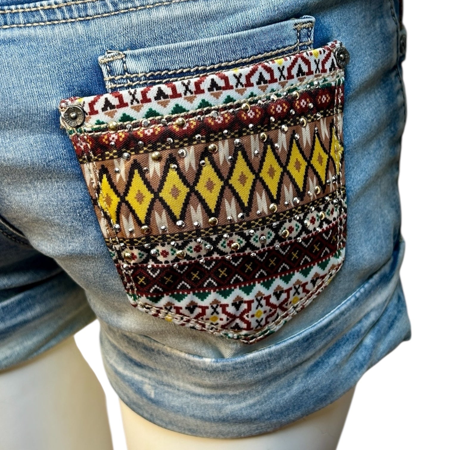 Estos shorts de mezclilla estilo boho se destacan por sus bordados coloridos y aplicaciones tribales en los bolsillos. Las cuentas decorativas y los detalles desgastados les dan un aire artesanal y libre. El contraste entre el denim claro y los motivos étnicos crea una pieza única, perfecta para climas cálidos y looks relajados con personalidad. Úsalos con sandalias, tops ligeros o blusas bordadas para un estilo desenfadado y vibrante.